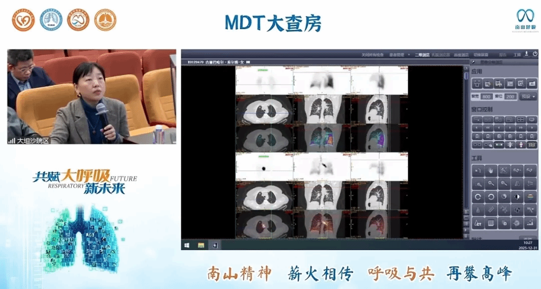 12月31日,核医学、放射科等跨学科专家带来的技术应用分享。钟院士领衔的专家团队针对纤维素性纵隔炎典型病例,组织多学科联合查房研讨。参会人员系统梳理洪城主任团队近300例纤维素性纵隔炎患者的临床研究结果,围绕疾病的临床症状特征、影像学表现、肺功能检查结果,以及PET-CT、OCT等精准检查的影像学特征展开深度剖析,全面阐述疾病的临床诊疗要点与研究进展。