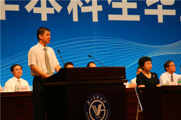 在讲话中,校长王新华勉励毕业生发扬不卑不亢的精神,他说:“我们虽然不是出身名门,但决不自卑。要弘扬广医人不甘落后,奋发直追的‘傲骨’之气”。王校长引用歌曲season in the sun, i have a dream,you raise me up,凭歌寄意激励同学们。