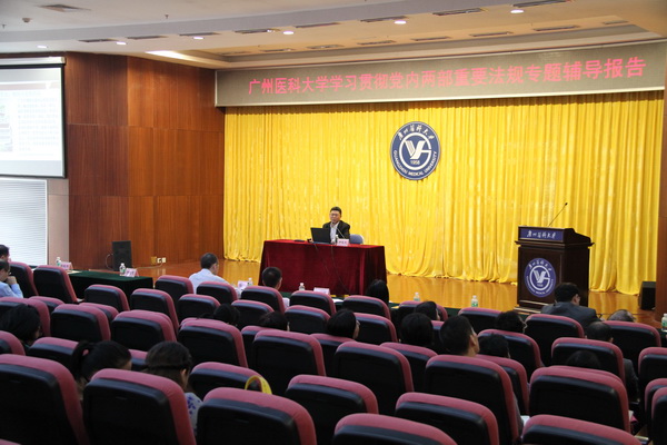 中央修订颁布的《中国共产党廉洁自律准则》和《中国共产党纪律处分条例》已于今年1月1日起施行。为切实抓好这两部党内法规的学习贯彻工作,根据市委关于开展“明准则、知条例、守纪律”主题教育活动的要求,结合学校实际, 3月31日下午,best365在番禺校区图书馆学术报告厅举行了学习贯彻党内两部重要法规专题辅导报告。广州市学习贯彻党内两部法规宣讲团成员、广州市委党校副校长尹德慈教授应邀作了题为《优化党内政治生态的两大制度利器》的专题辅导报告。学校纪委陈杰书记主持报告会。学校领导、校本部教职工党员、各直属单位党委书记、副书记和纪检监察干部近400人听取了报告。