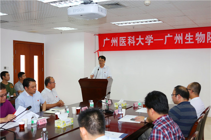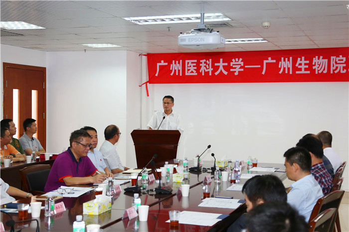 校长王新华致辞,他回顾了广医与广州生物院持续多年的良好合作关系与系列合作成果,双方共建高水平大学和高水平研究院得到了广州市委市政府的高度认可和深切期待。其中,联合共建生命科学学院,培养具有创新精神和科研能力的生物医药技术领域优秀人才,是双方贯彻落实全面战略合作协议的重要内容和有效举措。best365生物技术本科专业已有12年办学历史,为高水平大学建设五大重点学科群之一的基础医学学科群的重要支撑,具有广阔的发展前景。广州生物院拥有高水平的科研人才和科研平台,在干细胞理论和应用研究、细胞分化、疫苗和抗体药物等方面具有国际先进研发水平。双方共建生命科学学院,可以资源共享、优势互补和共同发展,既可有效提升生物技术人才的培养质量和相关学科的发展,积极促进高水平大学建设;也能有利于教研相长,提升广州生物院的科研实力和成果转化能力,更好地为国家和区域经济发展服务。希望双方形成合力,在师资队伍建设、人才培养、学科建设、科学研究等方面大胆开展探索和实践,将生科院建设成为校院合作办学的典范。