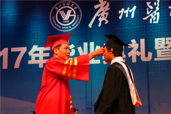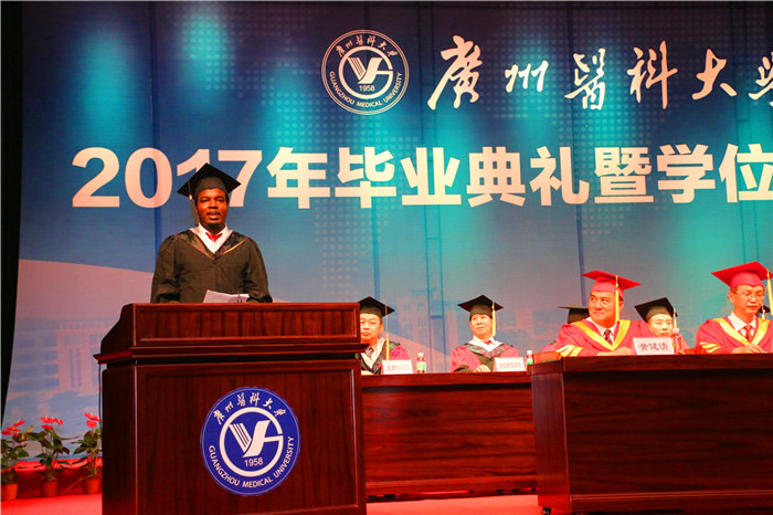 从本科到硕士,王潜同学和母校相识已经8年。与同学“一起求索过、一起奋斗过”,“恩师教会我的不仅是如何看验单和写标书,更教会我如何做人和做合格的医生。此刻,只想对母校说一声‘谢谢您,广医!’”来自坦桑尼亚的Silas,是2011级临床医学本科毕业生。初到广医时,他面对陌生的环境,在老师的帮助下,克服了重重困难,坚定了学医的信念和梦想。“几年前,第一次上解剖课时的紧张仍历历在目;几年后的临床实习时,病人称呼自己‘医生’,我们恨不得与全世界分享心中的惊喜与感动……”Silas代表毕业留学生说:我的大学,谢谢您!