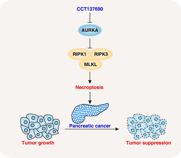 胰腺癌,因为死亡率高、治疗效果差而被称为“癌中之王”。课题组通过筛选激酶抑制剂药物库,发现极光激酶抑制剂CCT137690在体外和多种动物模型上能够显著诱导胰腺癌肿瘤细胞死亡;并且鉴定极光激酶A(AURKA)是一种程序性坏死( Necroptosis)负调控蛋白。上述研究不但阐明程序性坏死的新型调控分子机制,而且对于防治胰腺癌具有十分重要的意义。