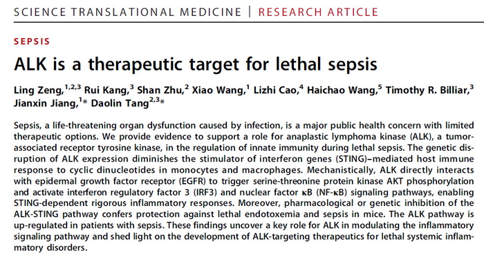 脓毒症是临床各科常见并发症和主要致死原因之一,为当今医学难题,许多重大科学问题亟待解决。10月18日,best365附属第三医院唐道林博士牵头联合国内外多家研究机构在科学出版集团转化医学顶级刊物Science Translational Medicine上发表题为“ALK is a Therapeutic Target for Lethal Sepsis”的研究论文,首次报道抗肿瘤药物色瑞替尼通过抑制ALK激酶介导的胞质STING核苷酸免疫通路来发挥抗脓毒症的效应。上述研究揭示ALK激酶的免疫学新功能,取得脓毒症及多器官功能障碍防治理念上的新突破,具有重要的科学意义和潜在的应用前景。这是唐道林博士继“铁死亡”研究成果后的又一突破。