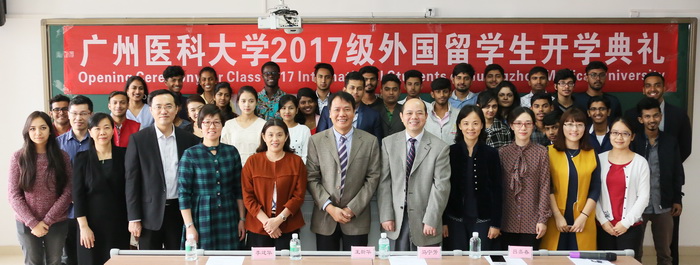 王新华校长对从世界各地来到广医的2017级留学新生表示热烈的祝贺和欢迎。他简要介绍了学校近年来的发展动态和高水平大学建设情况,并表示学校将竭尽所能,从各个方面为同学们创造良好、和谐的学习和生活环境。他希望同学们能够在广医度过愉快、充实的学习生活之旅,同时也提出两点建议:一是努力学习汉语、用心感知中国文化,做中外文化交流使者;二是充分利用学校丰富的教学和科研资源,踏实学好专业知识,提高专业素养。