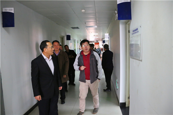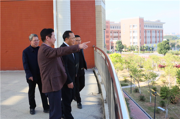 卢一先一行实地考察中法霍夫曼免疫研究所、师生活动中心、图书馆以及校园环境,并在师生活动中心三楼听取了学校领导对二期项目地块情况的介绍。