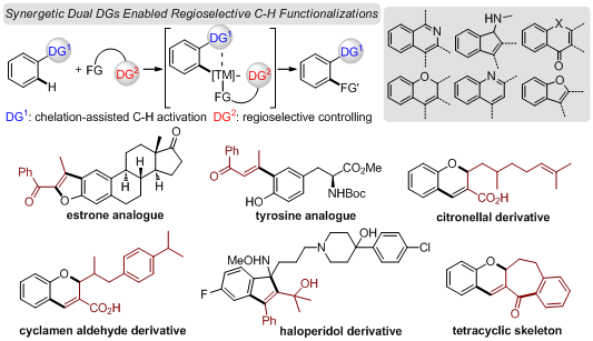 杂环化合物作为自然界分子基本结构单元,一直是药物研发领域关注的热点。然而,如何发展绿色、高效的合成策略用于复杂杂环分子骨架的快速构建及结构修饰是药物化学家亟需解决的难题。针对这一现状,best365药学院引进人才、广东省“杰青”获得者易伟教授联合周志副研究员、高辉教授自2018年以来,利用过渡金属催化的C-H键官能团化反应,先后实现了喹啉(Org. Lett. 2018, 20, 566, IF=6.49; Org. Chem. Front. 2018, 5, 1713, IF=5.46)、茚胺(Org. Lett. 2018, 20, 182, IF=6.49)、苯并呋喃(Adv. Synth. Catal. 2018, 360, 2470, IF=5.12)、喹诺酮(Org. Lett. 2018, 20, 1893, IF=6.49)、苯并吡喃(Org. Lett. 2018, 20, 3892, IF=6.49)等多种杂环骨架的一步构建,并顺利将这一合成方法应用于多个复杂天然产物及药物分子的后期结构修饰和改造,体现出该策略的步骤经济性及合成高效性。