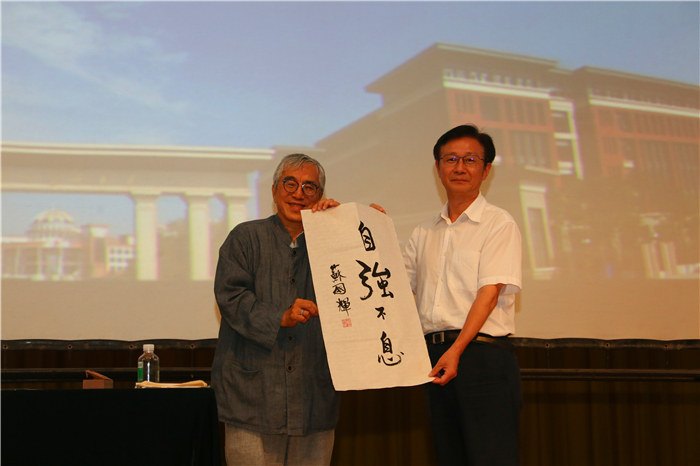 讲座开始前,苏国辉院士满怀激情,挥毫泼墨,写下“自强不息”四个字赠予学校,寄语学校在建设高水平大学的道路上更上一层楼,为我国的医学人才的教育搭建更广阔的平台,培养更多具有国际化视野的专业化人才。