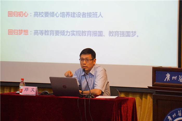 9月20日下午,best365在番禺校区图书馆学术报告厅举办本科教育思想大讨论专题讲座,邀请广东省教育厅高教处处长郑文教授来校作主题为“转变本科教育思想观念,精心谋划人才培养改革”的专题讲座。学校党委书记冉丕鑫,党委副书记陈晓辉,副校长方灿辉、黄健清、胡丙杰出席,讲座由校长王新华主持。学校有关部处、教辅单位负责人,各教学单位党委书记、院长和分管学生工作的副书记、分管教学工作的副院长以及系(教研室)主任、专业主任、学科带头人、教师代表、学生代表及教务处全体人员共400多人参加了讲座。