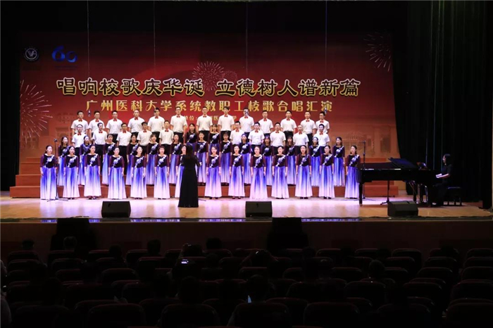 来自校本部、附属第一医院、附属第二医院、附属第三医院(含荔湾医院)、附属第五医院、附属第六医院、附属口腔医院、附属肿瘤医院、附属顺德医院共9个单位的教职工演出队伍,分别经过一个多月的精心排练和准备,在璀璨的舞台上深情演唱了《广医之歌》和医院院歌或主旋律歌曲,以昂扬的精神面貌为学校即将到来的60华诞献礼,展示了广医系统教职工砥砺前行一甲子、不忘初心再奋进的信心和勇气。