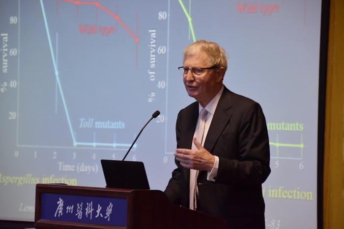 霍夫曼教授围绕“从昆虫到人类的天然免疫”主题,通过对不同时期的人类寿命统计,讲述免疫学以及微生物学对人类延寿的作用,总结出抗感染性疾病研究的重要性。以昆虫作为研究模型,把和人类健康、疾病相关的基因中有同源基因的果蝇作为研究对象,诱导天然免疫的产生。这个领域里面最值得关注的是在脊椎动物中,天然免疫不仅仅是机体的第一道防线,它在控制、启动适应性免疫方面也起着重要作用。