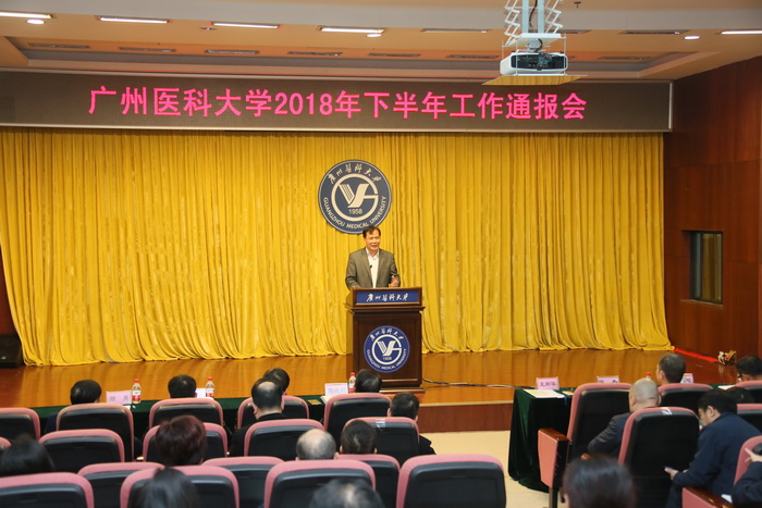 王校长从六十周年校庆展现新风貌、番禺校区二期建设取得新突破、教育教学取得新成果、学科建设迈上新台阶、科研工作取得新突破、人才队伍实现新提升、学生工作产生新成效、合作交流开创新局面、附属医院发展实现新跨越、党建工作开启新常态、管理服务获得新提升十一个方面总结了2018年工作情况。