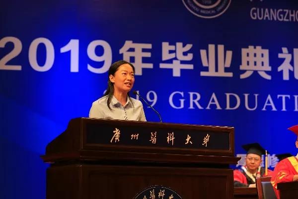 教师代表第一临床学院秦茵茵教授发言。她通过回顾自身历程,勉励同学们坚守理想,敢于追梦;独立思考,甘于寂寞;直面现实,不怕挫折;学会感恩、勇于担当。“无论黄昏把树的影子拉得多长,它总是和根连在一起”,她说,广医永远是学子的坚强后盾。