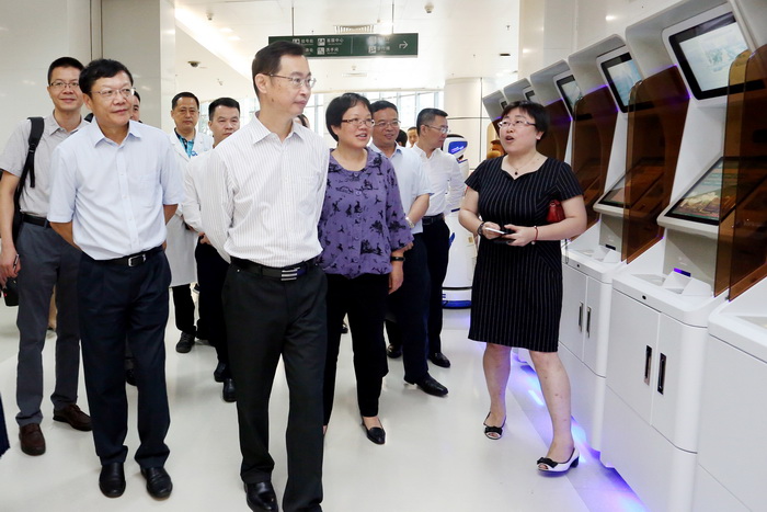在附属第二医院院党委书记、院长刘世明的陪同下,温国辉市长一行先后来到医院远程医疗云平台示范基地、门诊自助服务区域、入院准备中心、互联网医院诊疗中心,听取有关负责人介绍各项服务流程与创新技术。温市长肯定附二院以改革创新为动力,以健康惠民为出发点,持续推进信息化工作,逐步推进“互联网+医疗”进程,为群众提供更优质更便捷的医疗便民服务。