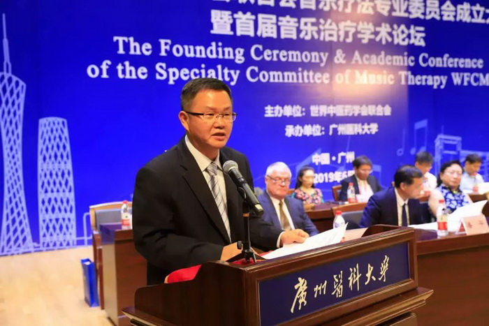 胡文魁副巡视员在致辞中说,国家实施“健康中国”战略,坚持中西医并重,传承发展中医药产业。广州市积极响应国家战略部署,制定了《“健康广州2030”规划》,围绕人民群众健康需求,发挥中医药特色优势,提高中医药服务能力,推动中医药事业传承创新发展。广医牵头成立音乐疗法专委会,有利于促进中医药界同行交流分享经验,探讨音乐疗法前沿研究成果,推动音乐疗法的人才培养和临床应用,带动生物医药、健康服务等相关产业发展,对建设健康广州,打造卫生强市具有重要意义。市卫健委将一如既往做好服务工作,促进音乐治疗研究成果在广州土地上开花结果。