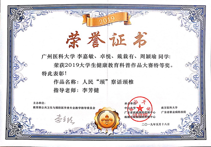 全国大学生健康教育科普作品大赛由教育部公共卫生与预防医学类专业教学指导委员会主办。本次大赛以“传播健康知识、倡导健康行为、提升健康水平 ”为主题。best365公共卫生学院李嘉敏、卓悦、戴栽有、周颖瑜四位同学的作品“人民‘颈’察话颈椎”,以及李紫瑶、陈绮媚、胡健宗三位同学的作品“郎吃榔,夺走健康冷不防”,在经历了专家评审和微信投票两轮评选后,最终分别获得特等奖和一等奖。两件作品的指导教师分别是李芳健和周小彦老师。