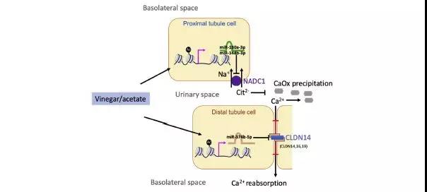 随后研究人员通过动物实验发现,给予大鼠服用陈醋,或者服用5%的醋酸(陈醋的主要成分),可明显升高大鼠尿液中的枸橼酸含量,并减少尿钙排泄,而且减少了肾脏草酸钙晶体的形成。在进一步分子机制研究中,研究人员通过体内及体外实验,从多个角度证实了陈醋中的醋酸,可以促进肾小管细胞的组蛋白H3K9及H3K27的乙酰化水平,随后激活了microRNAs-130a-3p,-148b-3p和-374b-5p的表达,从而分别抑制了位于肾近端小管的Nadc1枸橼酸转运体,以及位于髓袢的Cldn14钙离子转运体,进而升高了尿液中枸橼酸的含量以及减少了尿钙的排泄,最终抑制了尿液中草酸钙晶体的形成。