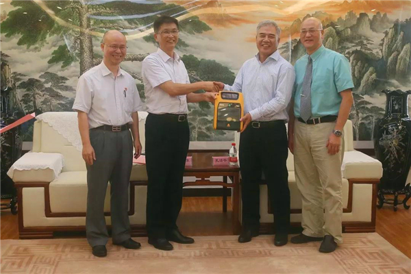 84级校友会代表向学校捐赠AED 5台,84级校友会会长孔活平先生以个人名义向学校捐赠1台,副校长罗健东教授、学生处陈伟民处长代表学校接受捐赠。