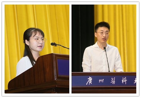金域检验学院医学检验技术专业的朱婧安同学代表新生发言。她向家人、师长致以诚挚的感谢,也为努力拼搏的自己喝彩。她认为,学习要与实践相结合,将专业知识运用到实际工作中,在实践中完善体格与智慧,在实践中履行社会责任。新一代广医人立志成为守护人民健康的中坚力量,要把“敬佑生命、甘于奉献、大爱无疆”的信念种在心里并让它根系终身。