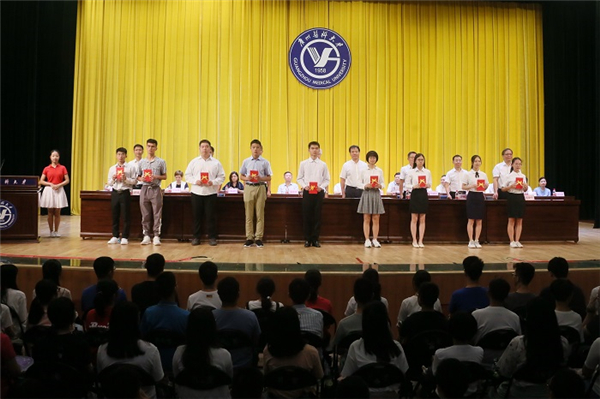 学校领导为新生奖学金获奖代表颁奖