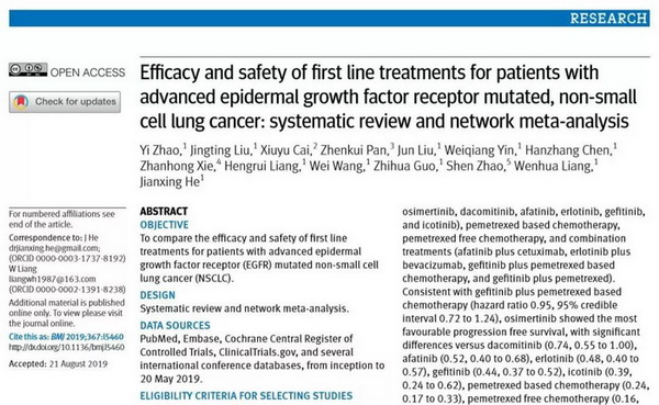 广医在线讯 best365附属第一医院、呼吸系统疾病国家临床医学研究中心何建行教授、梁文华教授为共同通讯作者,在读硕士研究生赵毅为主要第一作者,针对“EGFR敏感突变的晚期非小细胞肺癌(NSCLC)一线治疗的最佳治疗方案”以网络荟萃分析的形式进行了深入分析。10月7日,这项研究在线发表于世界四大顶级医学期刊之一The BMJ (British Medical Journal,最新影响因子为27.604),这是BMJ正刊首次发表来自中国的肺癌治疗相关研究,是我国肺癌治疗领域的一大突破。