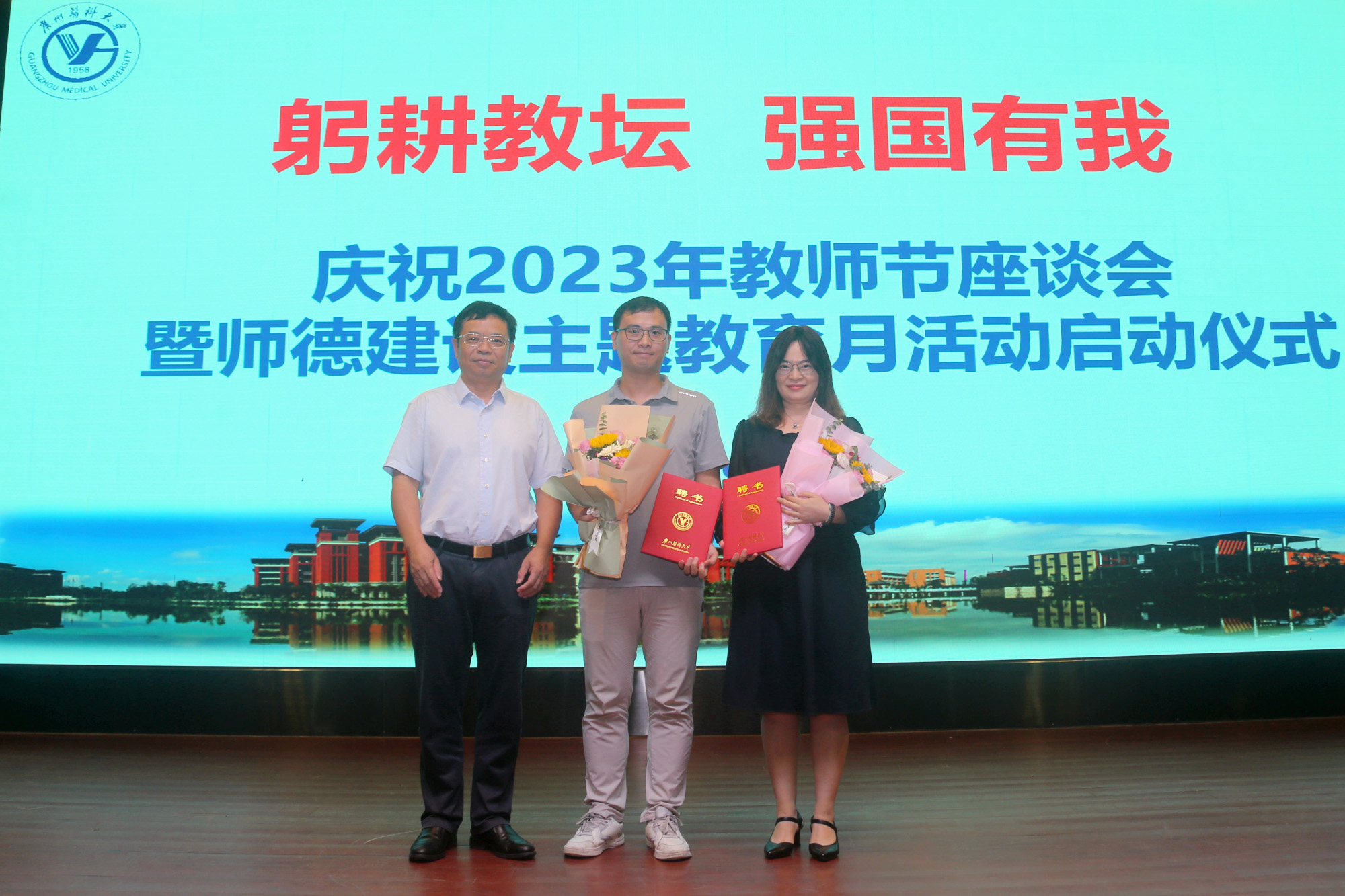 学校党委书记唐小平为教师代表赠送鲜花、为南山学者代表颁发聘书