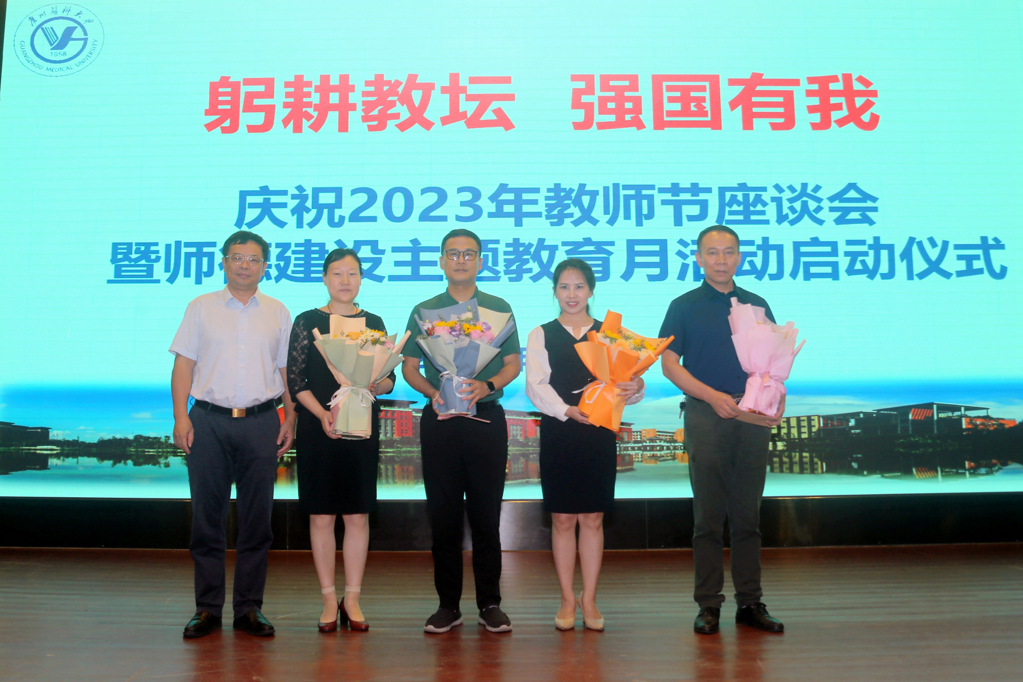 今年教育部确定的教师节主题是:躬耕教坛,强国有我。广大教师和教育工作者要深刻认识到,我们在教育强国、科技强国、人才强国建设中肩负的光荣使命与重大责任,全方位提升自身能力,努力培养造就更多德智体美劳全面发展的社会主义建设者和接班人。对此,他结合学校发展,提出四点要求:
