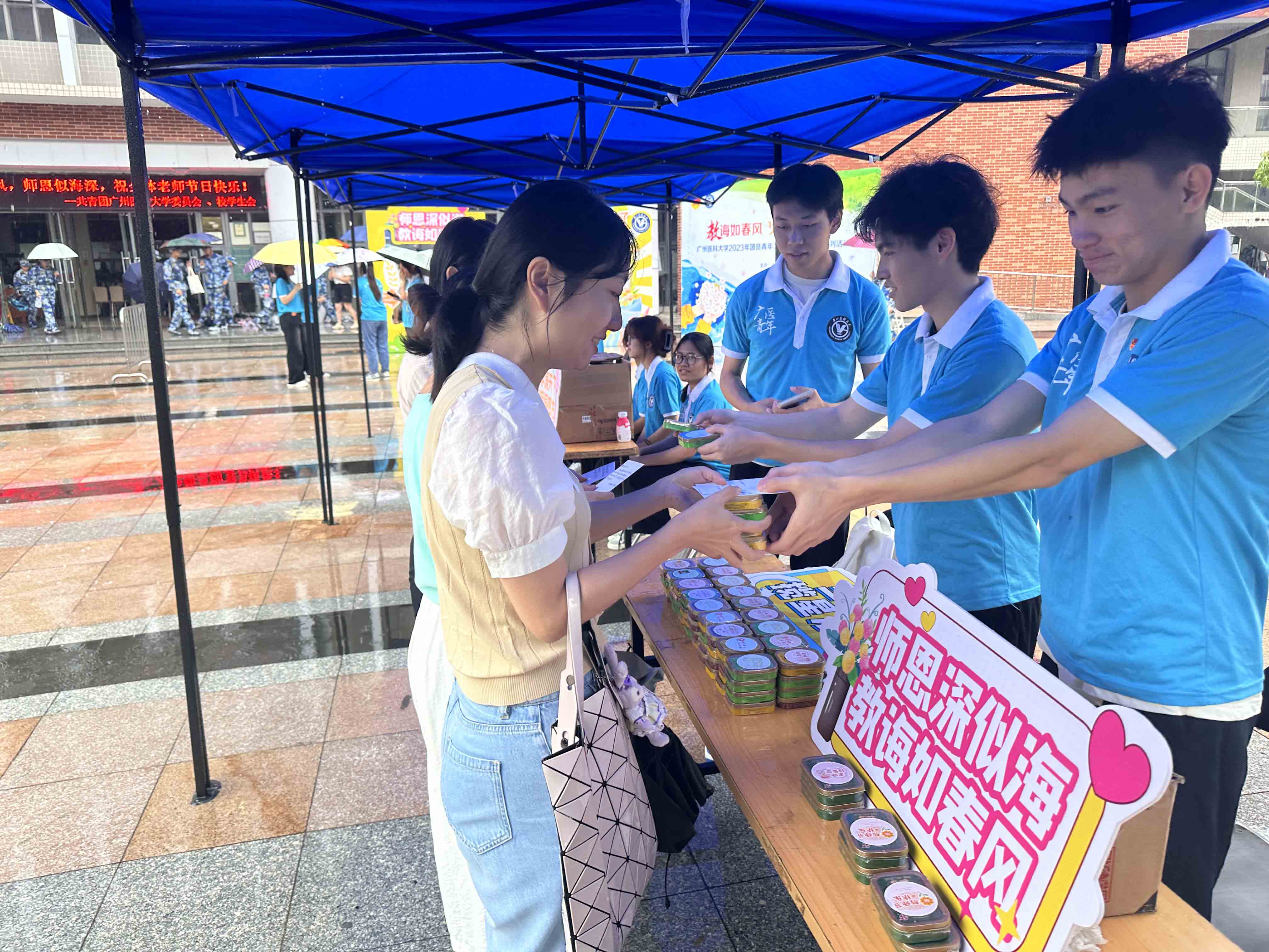 9月8日,校学生会在番禺校区食堂门口设立“青春感师恩”青年学生庆祝教师节摊位,为老师赠送润喉糖和节日贺卡。