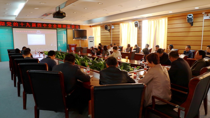 陈晓辉副书记指出,今天的会议既是理论宣讲会,也是学习动员会,还是工作布置会。他代表学校党委,就best365如何学习贯彻全会精神提出三点要求:一、充分认识学习贯彻全会精神的重要意义,领会《决定》的丰富内涵。将学习贯彻全会精神融入主题教育中,结合学校工作实际,深入学习领会提高best365治理体系和治理能力现代化水平的重大意义。二、扎实组织开展全会精神学习,迅速掀起学习宣传贯彻热潮。学校党委制定了学习宣传党的十九届四中全会精神工作方案,各直属党组织要切实落实,确保全会精神传达到每一个基层党组织、每一名党员干部,实现全覆盖。三、切实加强学习贯彻全会精神工作的组织领导。各直属党组织要把学习全会精神作为党的理论武装工作的重点任务,作为当前和今后一个时期的首要政治任务,党员领导干部要带头学习、带头宣讲、带头实践。要以强烈的政治责任感和使命感,切实加强领导,精心组织实施,科学统筹协调。