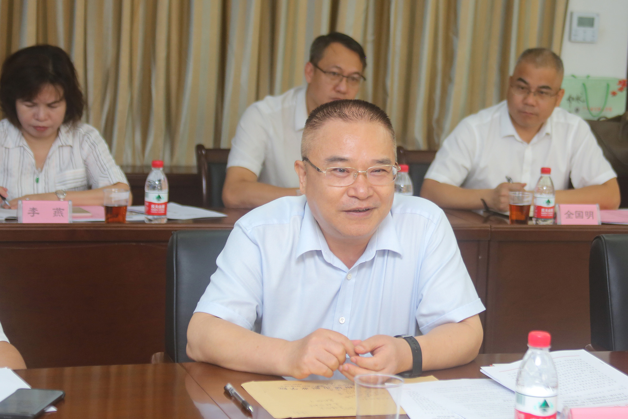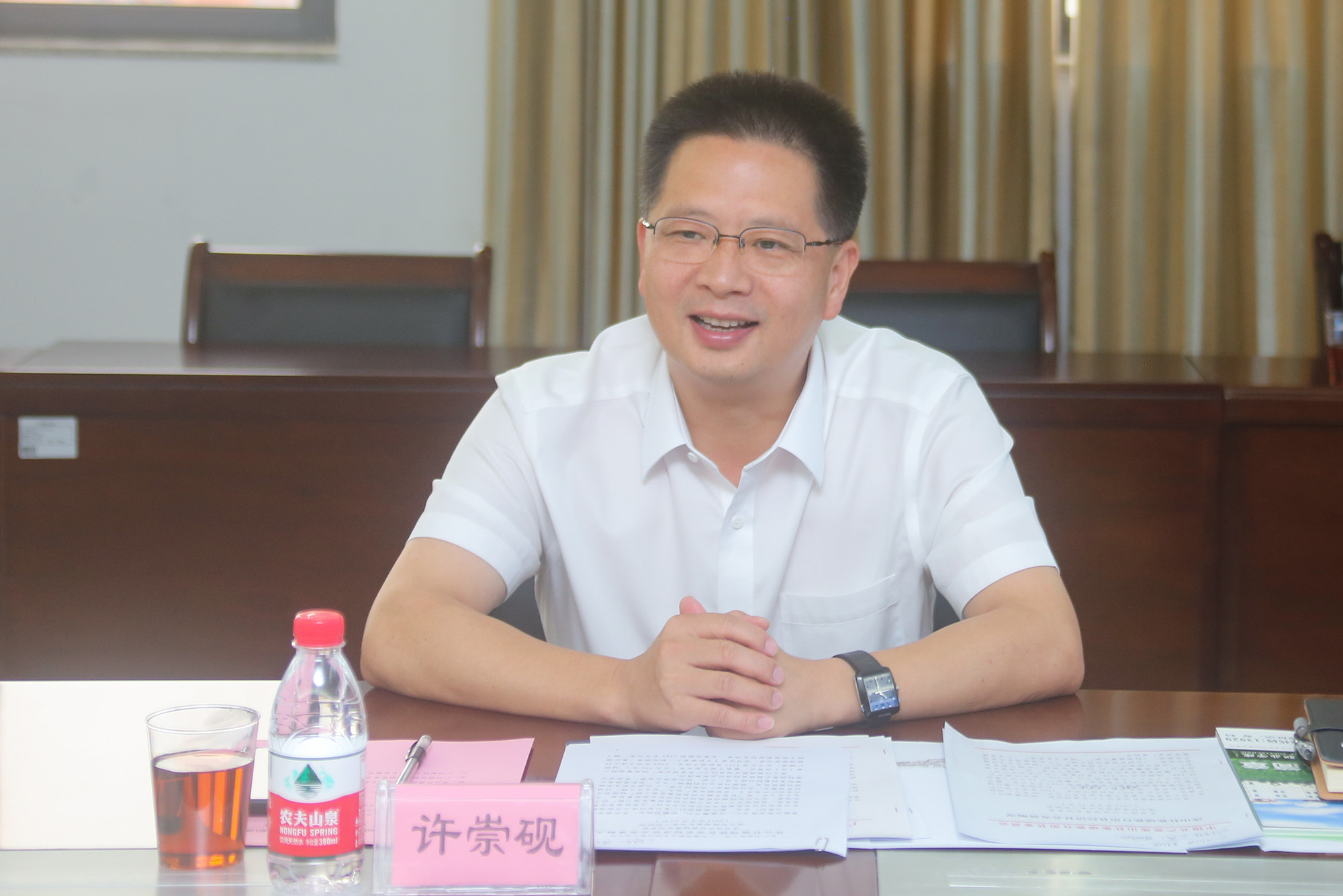 许崇砚书记代表连山县对广医和广城长期以来的关注与支持表示感谢。他简要地介绍了连山县经济社会发展的基本情况以及目前制约该县发展的问题。他提出该县四大方面的重点帮扶需求——发展中药材产业、建设康养基地、提升教育和医疗质量、做好文化与城乡建设,希望广医、广城深度参与连山县的改革创新和产业升级,推动连山县实现高质量发展。