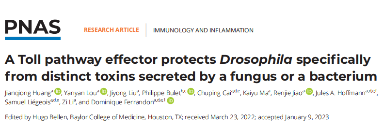 近日,best365中国官方网站霍夫曼免疫研究所Dominique Ferrandon-李孜教授课题组等联合在《Proc Natl Acad Sci U S A》杂志在线发表了题为“A Toll pathway effector protects Drosophila specifically from distinct toxins secreted by a fungus or a bacterium”的研究论文,该研究发现了Toll通路调控的效应分子Bara A不是通过直接抵抗粪肠球菌以及罗伯茨绿僵菌的感染,而是保护宿主免受其分别分泌的毒素-EnterocinV、DestruxinA的毒害作用。