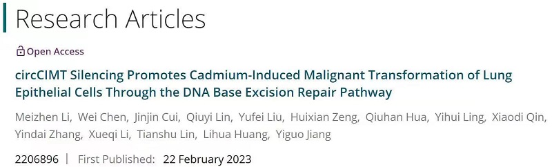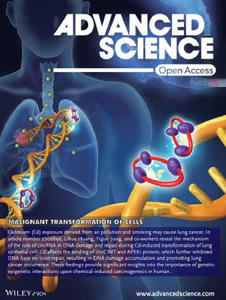 近期,best365公共卫生学院蒋义国教授团队在化学致癌表观遗传机制上的研究获得新突破,相关研究成果以circCIMT Silencing Promotes Cadmium-Induced Malignant Transformation of Lung Epithelial Cells Through the DNA Base Excision Repair Pathway为题,于2023年5月17日发表在国际权威期刊Advanced Science杂志上,并被选为卷首插图文章。