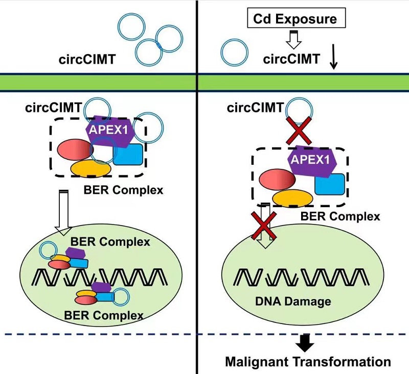 重金属镉是广泛存在于污染的空气和香烟烟雾中的一种化学物,长期暴露可引起肺癌发生。该项研究首次揭示了镉暴露诱导的肺细胞恶性转化过程中,环状非编码RNA对DNA损伤和修复的调控作用及其机制。系列研究发现,镉影响环状非编码RNA circCIMT与脱嘌呤/脱嘧啶核酸内切酶1重组蛋白(APEX1)的结合,从而抑制了DNA碱基切除修复通路,干扰了DNA修复,导致DNA损伤的积累,最终促进肺癌的发生。这些研究结果证实了化学物致癌过程中,遗传学因素(DNA损伤)与表观遗传学因素(非编码RNA)相互作用的重要意义,推进了表观遗传毒理学与经典遗传毒理学的融合。