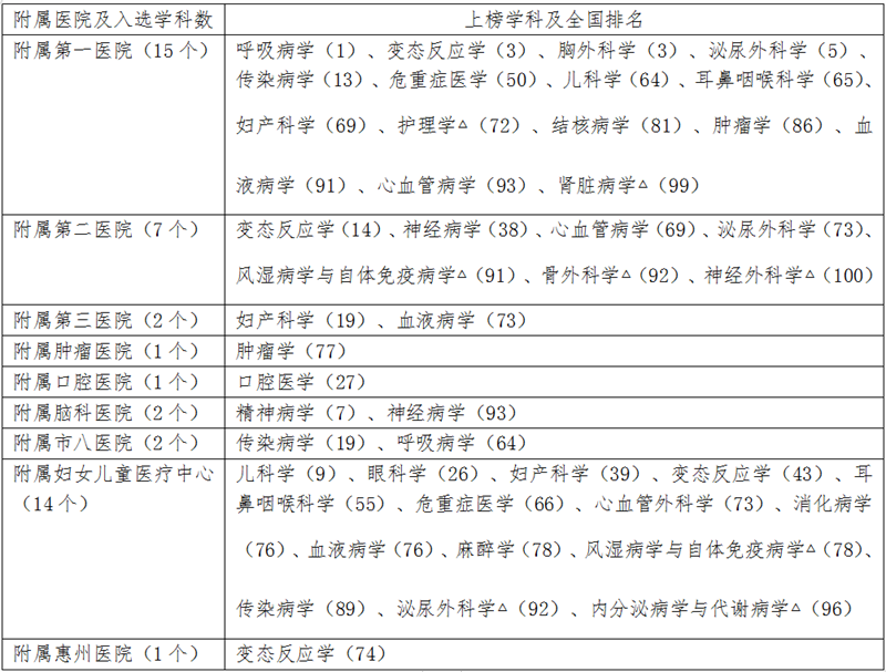 表1 best365中国官方网站各附属医院入选2022年度中国医院科技量值(STEM)排行榜学科一览表
