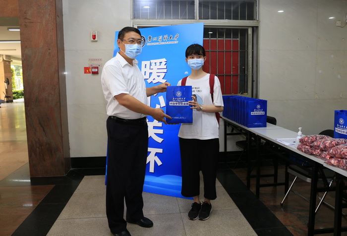 在学生报到处,王东副市长向刚刚从重庆返校的2015级中西医临床专业龙宣而同学赠送学校的防疫礼包