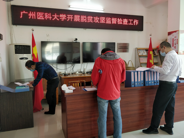 广医在线讯 2020年是脱贫攻坚决战决胜、全面收官之年。为巩固扶贫成果,打好精准扶贫精准脱贫攻坚战,4月10日,由学校纪委书记周国清带队,学校工会副主席、扶贫办主任冯卫东,纪委副书记程东海,学校机关第二党总支书记周如建,审计处副处长戚永忠,纪检监察室副主任翁永明,附属第五医院纪委书记吴璧锋,扶贫办林渺泉老师一行到访学校定点扶贫单位——清远市佛冈县汤塘镇高岭村开展脱贫攻坚监督检查工作暨调研慰问活动。汤塘镇党委委员朱光蔡、高岭村驻村干部和村两委干部等陪同检查和调研慰问。