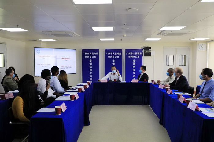 参加座谈的19名外籍人士来自非洲、亚洲等的16个国家,钟南山院士与他们一一握手问好。他们介绍了自己在广州的所见所闻,并向钟南山院士提出了诸如“外国在穗留学生如何防疫”“ 当前非洲和南亚如何防控”“ 什么时候需要戴口罩”“ 如何区分新冠肺炎和其他病症”“儿童如何诊断”“ 蚊子是否可能传播新冠肺炎”“ 疫情防控如何进行全球合作”等问题。