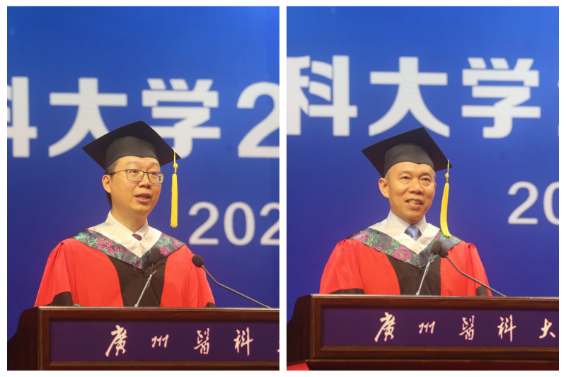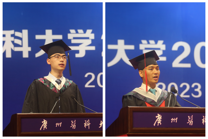 彭浩欣、黄志锋分别代表毕业本科生、研究生发言。他们分享了在广医学习生活的感悟与收获,并代表毕业生向师长的培养之恩表达最衷心的敬意与感谢。