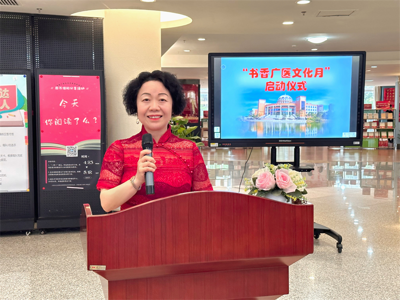 “阅读之星”钟思思同学分享了她的阅读故事。她说,自己小时候经常一个人独处,书籍一直陪伴她,成为了她的良师益友。可是她的家乡没有图书馆,学校的课外书也非常少,小时候的梦想就是为家乡建造一所图书馆,供大家一起看书。来到广医学习后,她非常享受“泡馆”阅读的时光。她表示,虽然平时课业忙碌,但会尽量挤出时间进行阅读。因为阅读是最让她放松的时刻,能帮助她调整心态,以更好地投入每日学习中。