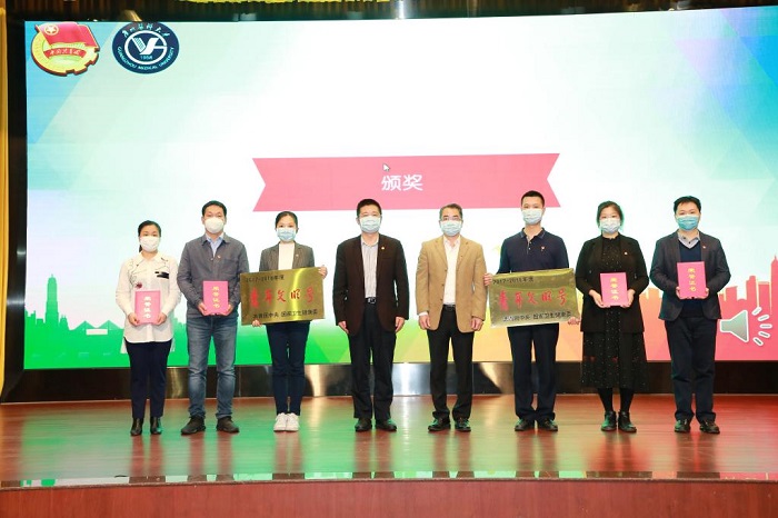 颁奖环节,学校党委陈晓辉副书记和赵醒村副校长分别为获得2019年全国青年文明号的附属第一医院儿科、附属第二医院急诊科代表,以及获得广东省2019年大学生暑期社会实践先进集体和个人的第二临床学院、卫生管理学院、护理学院、生命科学学院代表颁发奖牌和证书。