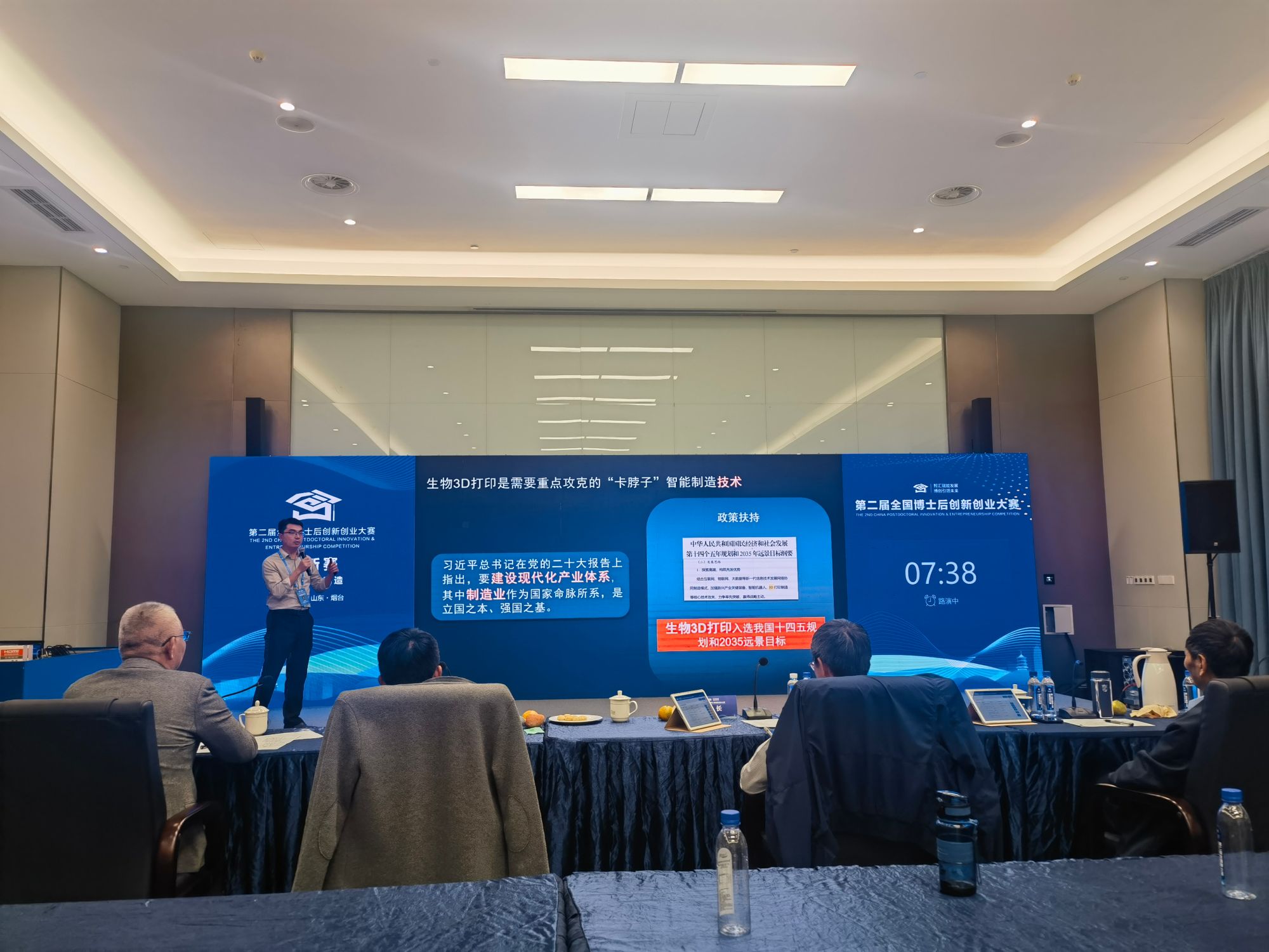 谢茂彬博士团队的《超快速体积生物打印机》以总分排名第三获得创新赛的银奖,团队成员吴佳琳是在站博士后,合作导师为唐国胜教授。