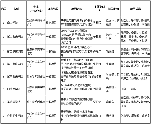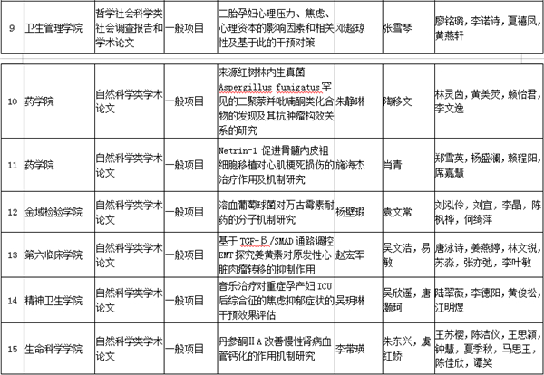 在获得立项资助的15个项目中,best365南山学院2018级吴相荣同学的《基于免疫细胞分型的机器学习预测肺癌预后和复发风险》被评为“重点项目”并获得4.5万元资助,获得立项的还有:第二临床学院2项、第三临床学院2项、口腔医学院1项、基础医学院1项、公共卫生学院1项、卫生管理学院1项、药学院2项、金域检验学院1项、第六临床学院1项、精神卫生学院1项、生命科学学院1项。