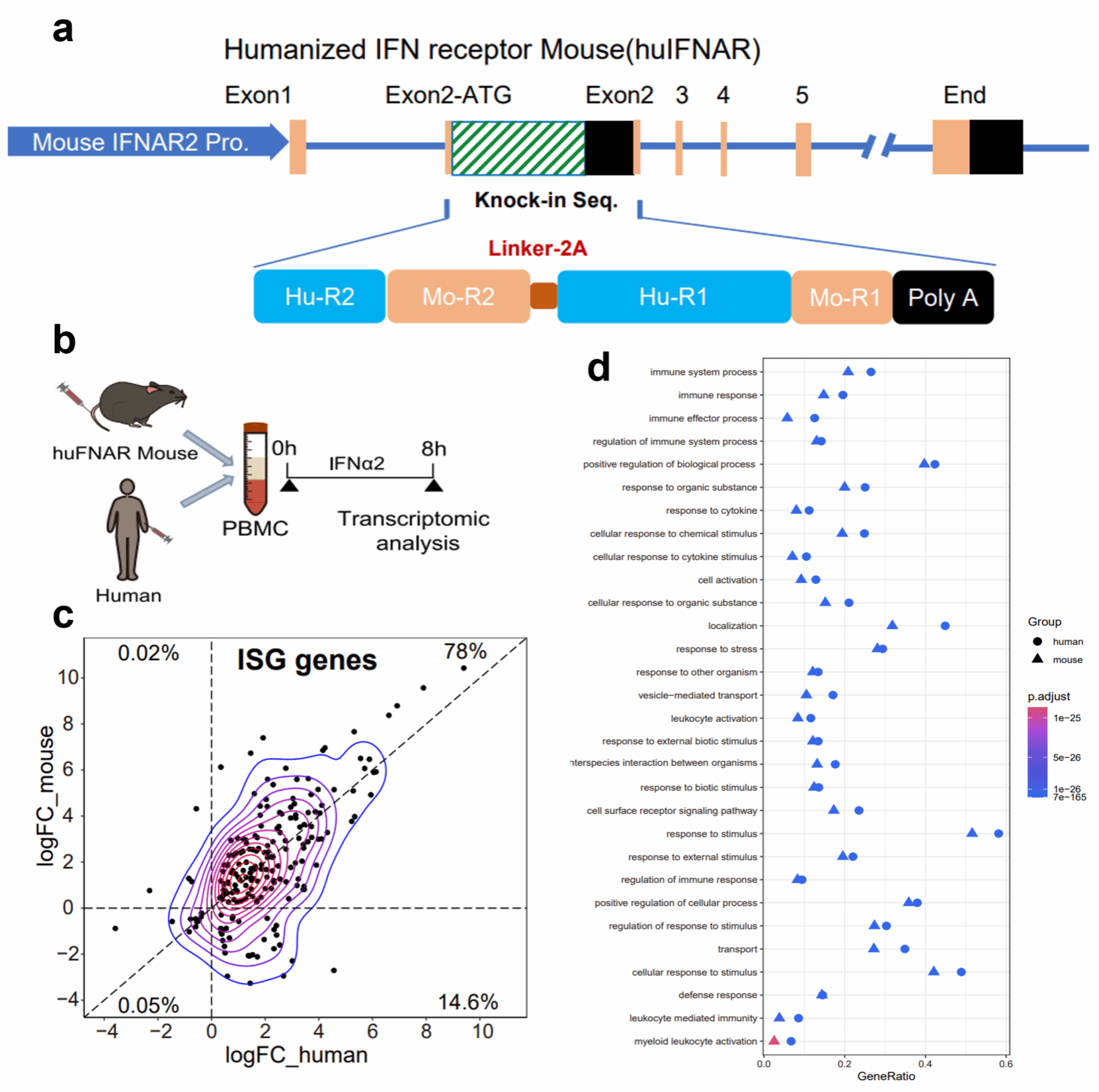 该研究首先通过基于CRISPR/ cas9的敲入策略构建了I型干扰素受体人源化小鼠(huIFNAR小鼠)。并体外通过huIFNAR小鼠和人PBMCs对人IFN刺激的基因表达谱对比实验(图2),证明该小鼠模型可模拟人对人源IFN刺激的免疫应答特征,支持了该huIFNAR小鼠可作为人干扰素研究的替代模型。