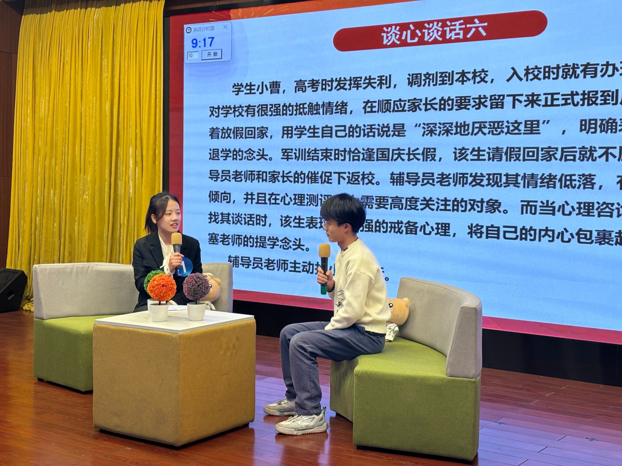 决赛的第二项是谈心谈话。在比赛中,参赛辅导员围绕大学生日常学习、生活现实中常见的问题与学生进行一对一模拟访谈,帮助学生纾困解难,给予正确建议和引导。
