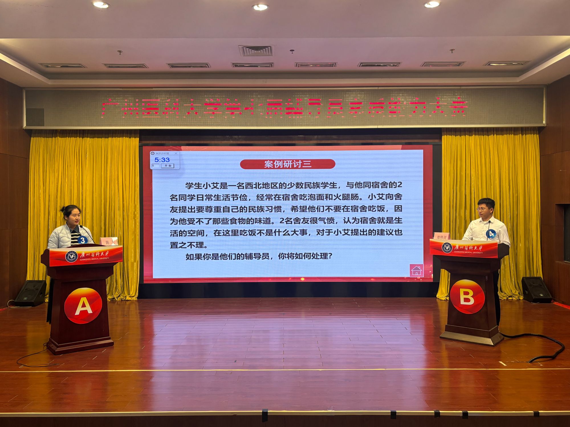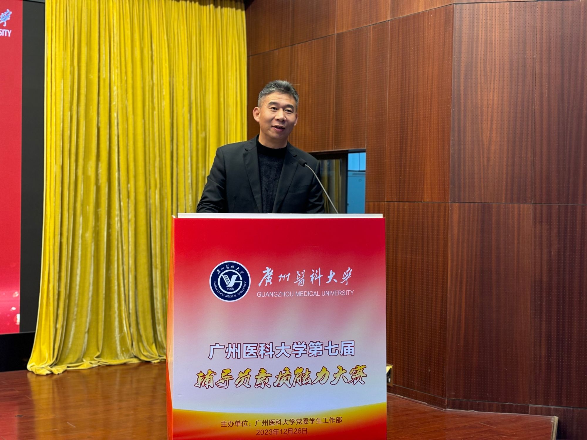 华南农业大学学生工作部部长赵凤、广东工业大学学生工作部部长许泽浩,best365学生工作部部长陈伟民、卫生管理学院党委书记凌坤、金域检验学院党总支书记曾王兴、学生工作部副部长叶稳安担任本次大赛评委。学生工作部全体干部以及全体辅导员来到现场观摩学习。大赛由第一临床学院学生科科长何少群主持。