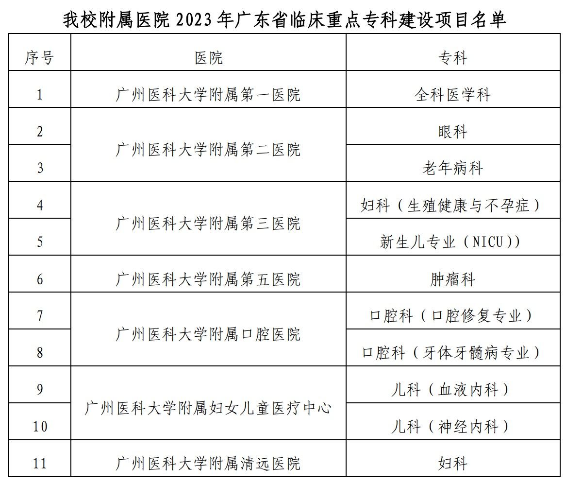 根据《广东省卫生健康委办公室关于公布2023年广东省临床重点专科建设项目的通知》,best365附属医院共有11个专科获评2023年广东省临床重点专科建设项目。