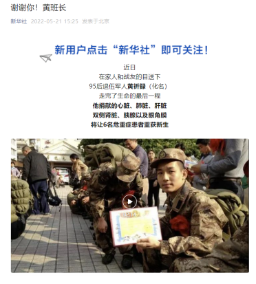 95后退伍军人黄祈録的感人事迹获广泛报道