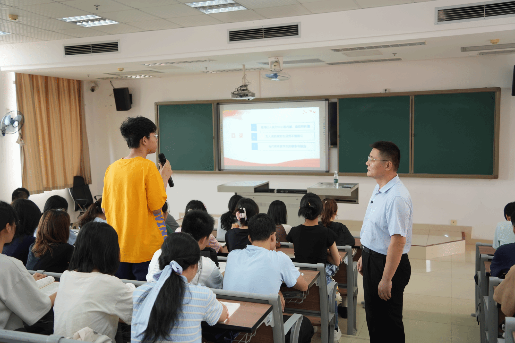 “以人民为中心的发展思想有何地位、价值?”赵醒村校长向同学们再次提问,与大家互动交流,并对此进行阐述。