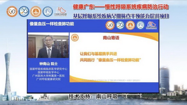 钟南山院士以在线视频形式表达对项目的支持。他指出:要实现慢性疾病防治的目标,“早发现、早干预”是关键,规范健康管理是重点,基层的能力提升是保障,尤其是基层肺功能检查的能力提升更是重中之重。