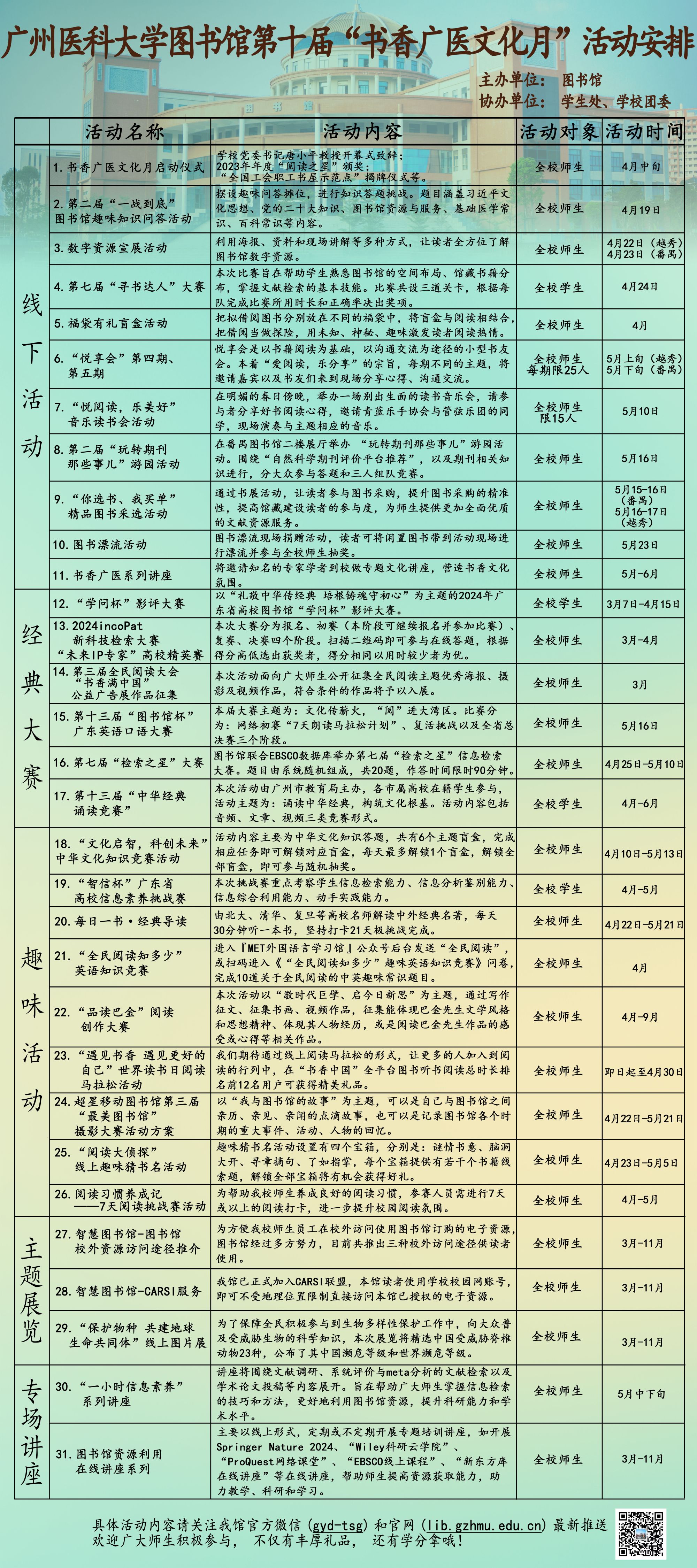 此次“书香广医”文化月将开展“寻书达人”大赛、“悦享会”、“你选书 我买单”精品图书采选活动、“悦阅读,乐美好”音乐读书会、信息检索大赛等经典活动,以及“一战到底”知识问答、福袋有礼盲盒活动、“玩转期刊那些事儿”等趣味创新活动,引领师生徜徉书海、沉浸阅读,提升读者文化自信和人文修养,丰富校园文化生活。