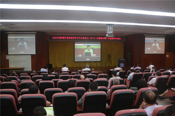 随后,与会人员观看了第36期广东高校学习论坛视频,华南师范大学马克思主义学院院长、教授、博士生导师陈金龙作题为《读懂中国共产党百年历史的根本遵循——学习习近平总书记‘七一’重要讲话》的辅导报告。陈金龙教授从“全面建成小康社会”“明确中国共产党百年历史的主题”“概括伟大建党精神”“系统总结中国共产党百年历史经验”“习近平总书记七一重要讲话的总体评价”等方面,深刻阐述了习近平总书记“七一”重要讲话的重大意义、主要内容和丰富内涵,深入解读了中国共产党百年奋斗的光辉历程、伟大成就、宝贵经验和实践启示,伟大建党精神的深刻内涵和时代价值以及在新征程上以史为鉴、开创未来的根本要求,同时围绕讲话中提出的一系列新思想新观点新要求进行了系统讲解。